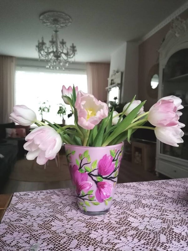 Mooie vaas van glas, beschilderd met Magnolia's! Haal de lente maar in huis!
