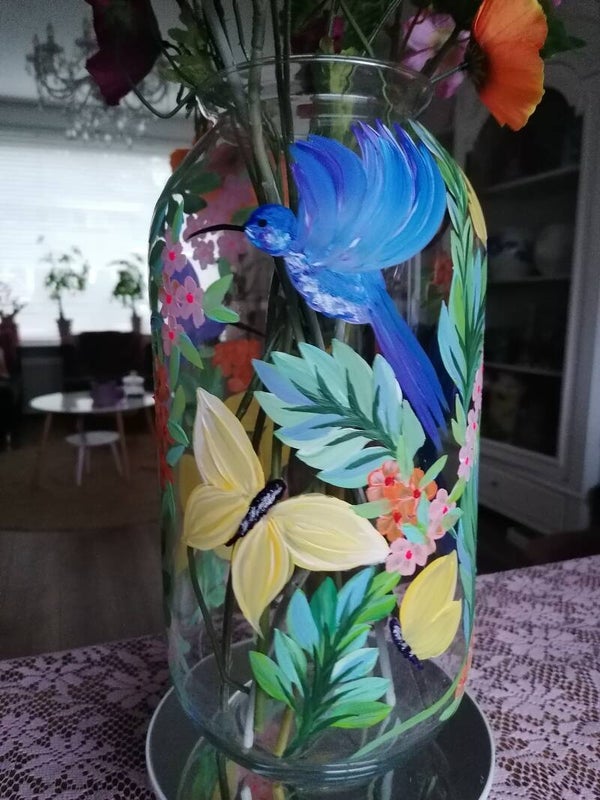 Deze prachtige grote lente vaas, is rondom handbeschilderd met Kolibrietjes, vlinders en bloemen. Een kunstwerk om naar te kijken, met of zonder bloemen!