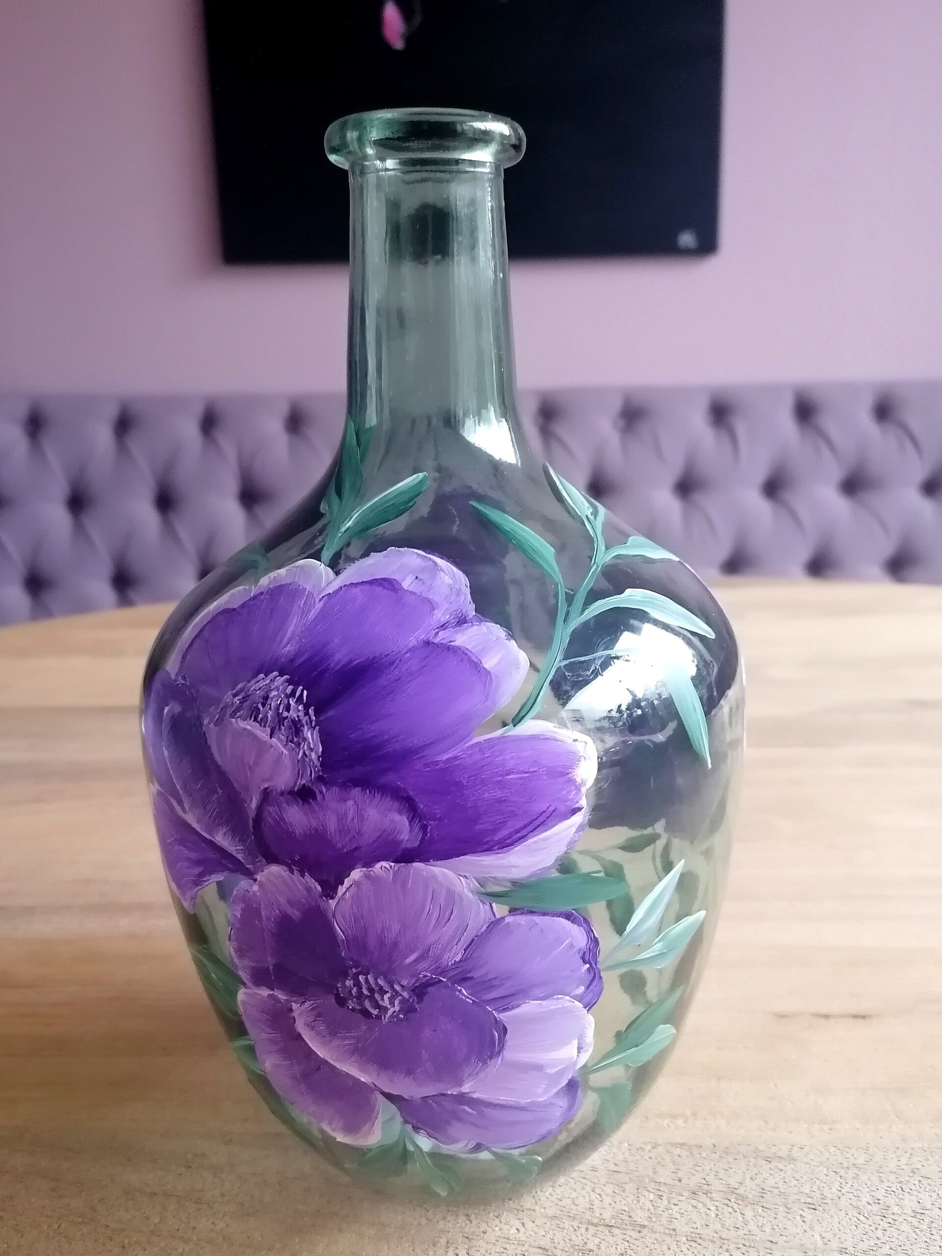 De paarse bloemen steken prachtig af tegen het groene glas!