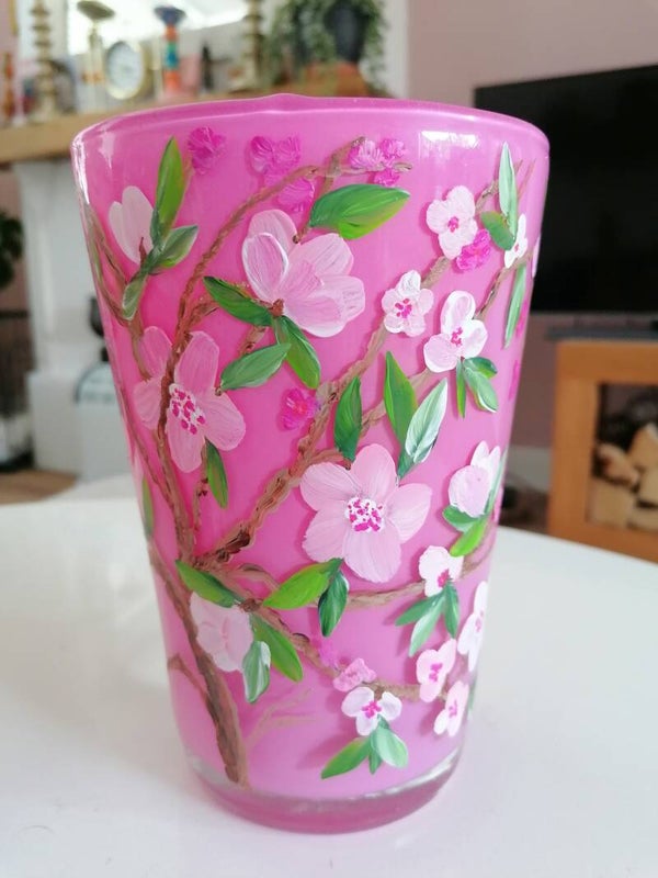 Deze mooie roze vaas van glas,