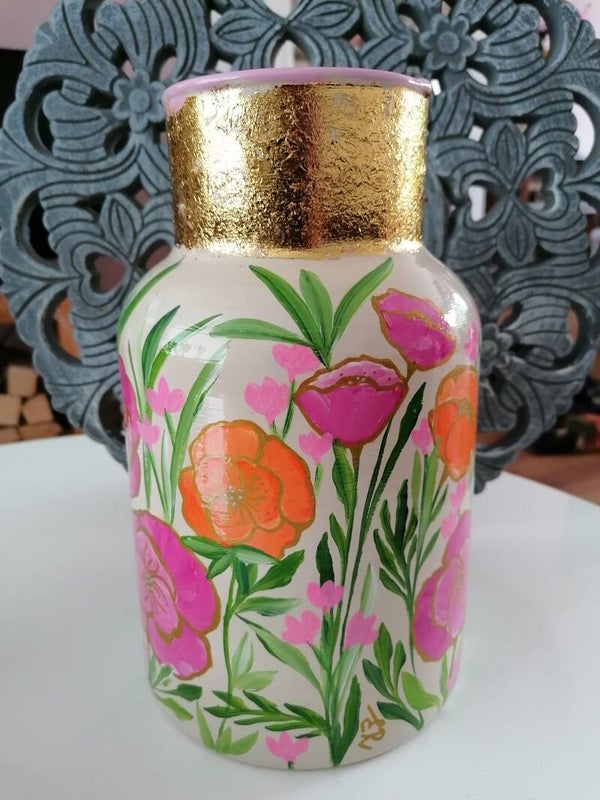 Op een Taupe kleurige vaas van glas, frisse roze en oranje bloemen. De bovenrand van de vaas is bedekt met GOUD