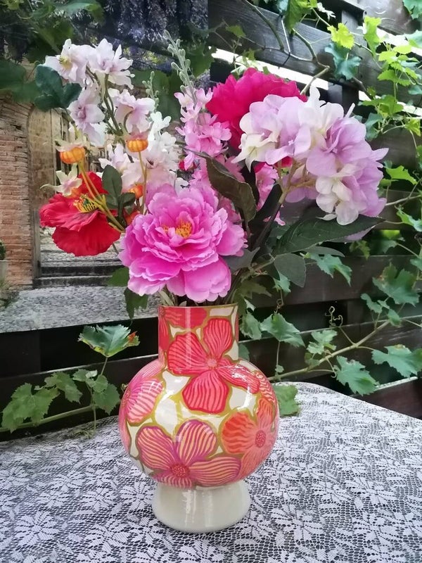Handbeschilderd met grote bloemen in roze/oranje tinten, wat een prachtige combinatie is dat toch.