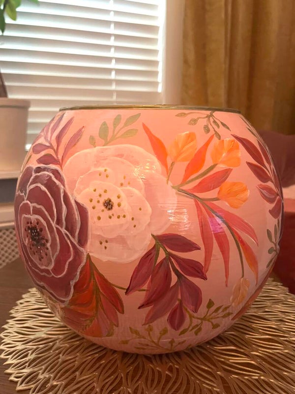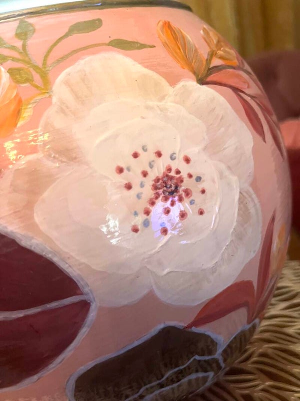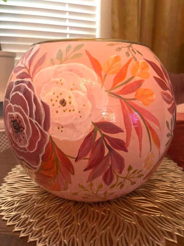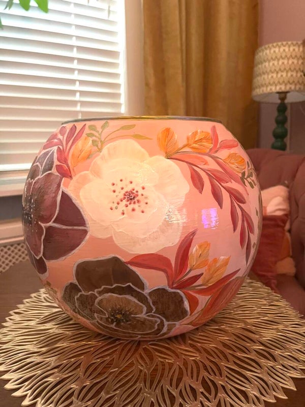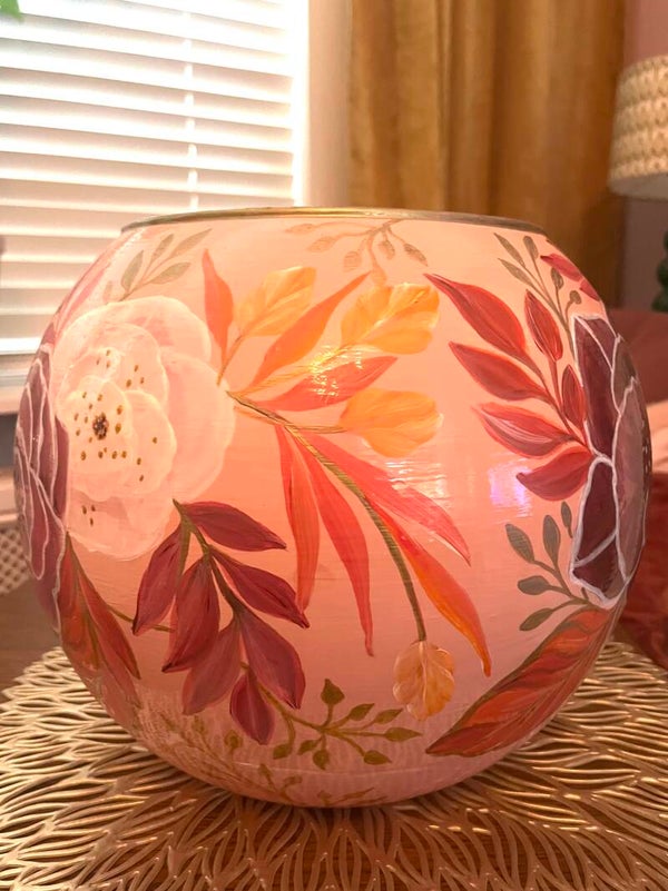 Handbeschilderde bolvaas in mooie herfstkleuren in combinatie met goud accenten.