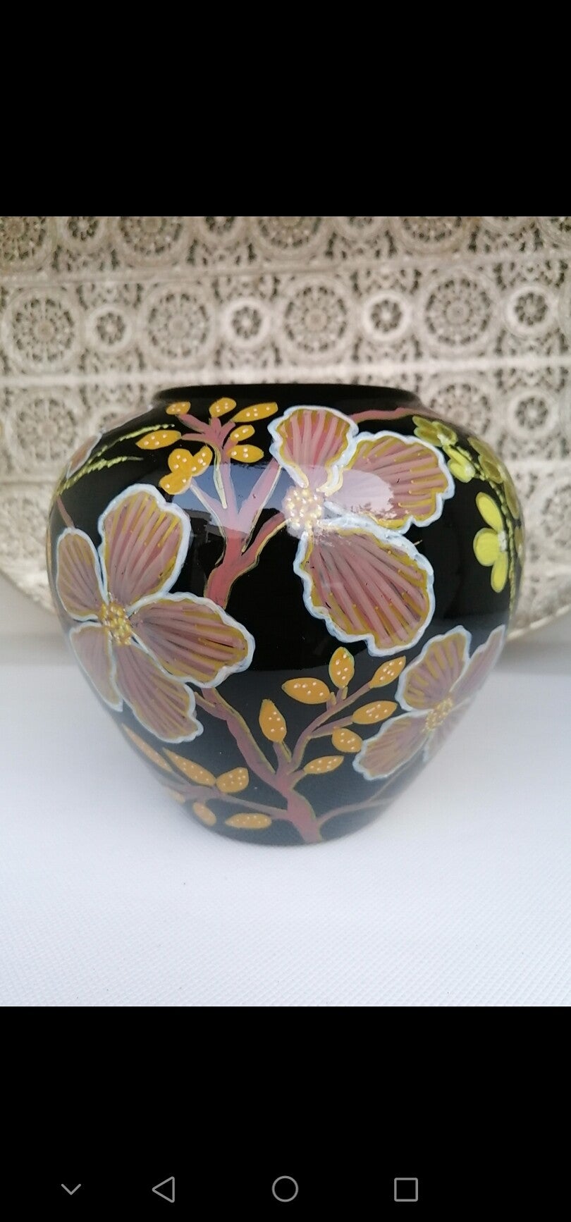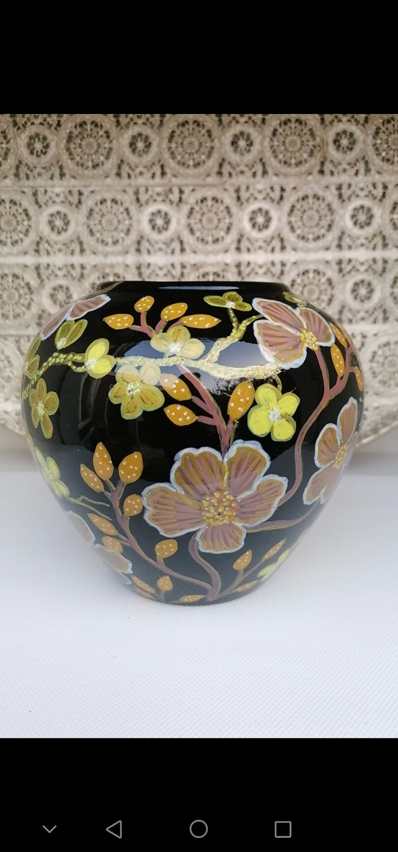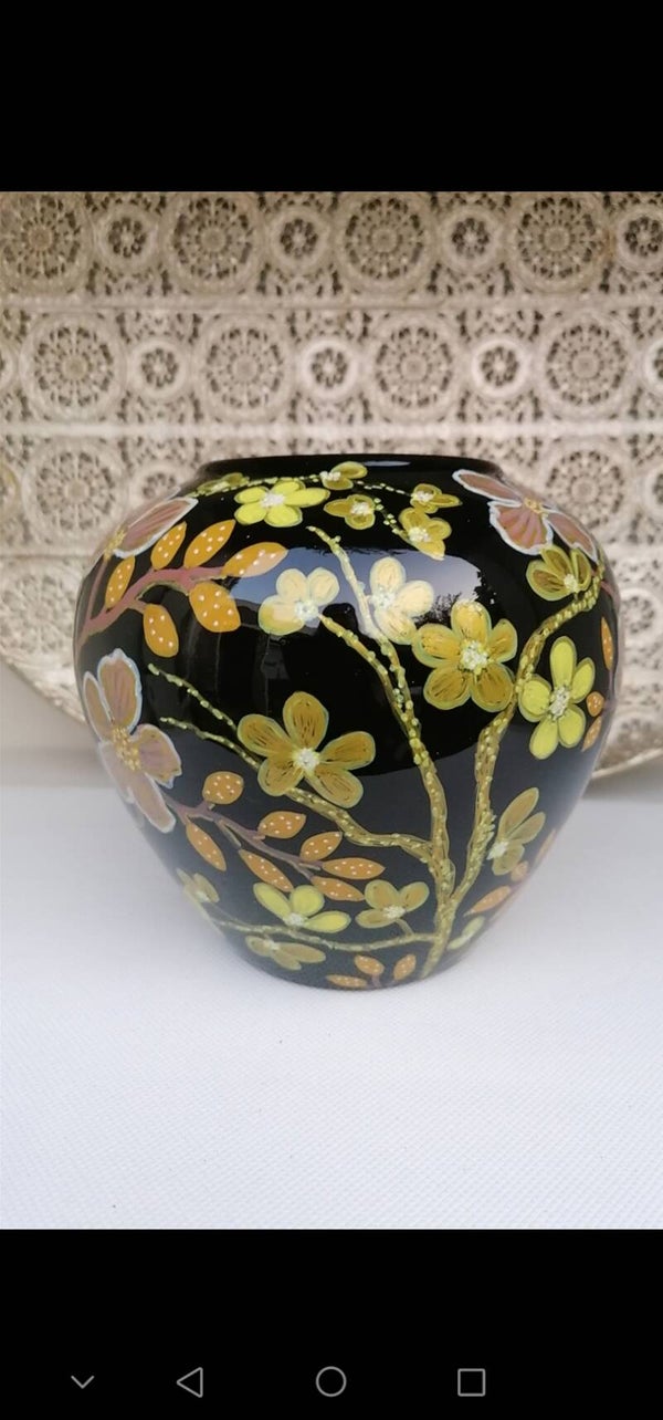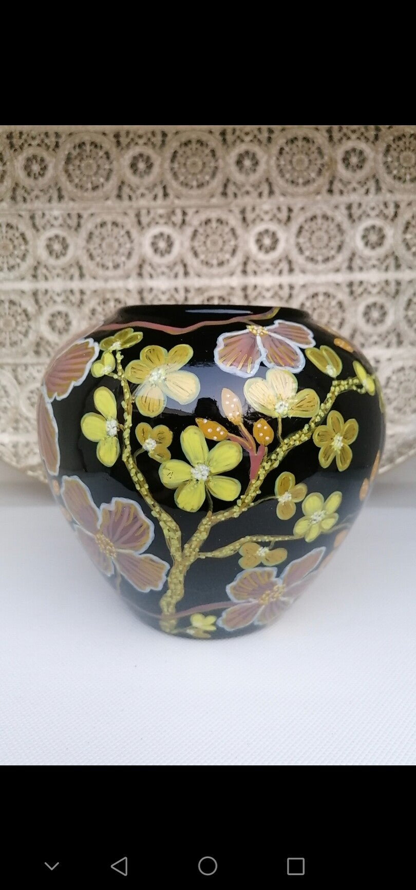 Deze bijzondere vaas is echt een sierstukje in huis! Deze vaas heb ik beschilderd /getekend met rondom sierlijke bloesem en andere bloemen. De kleuren steken zo prachtig af tegen de zwarte ondergrond! Geaccentueerd met goud.