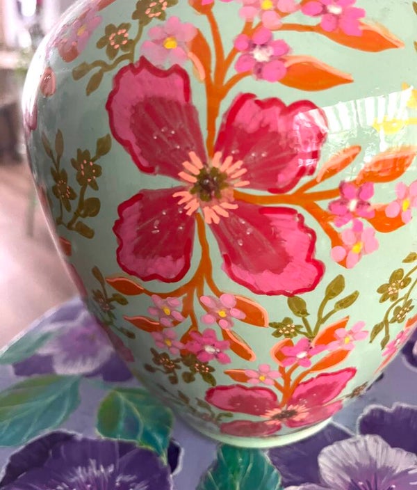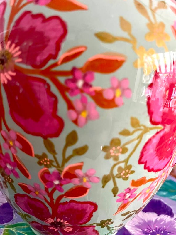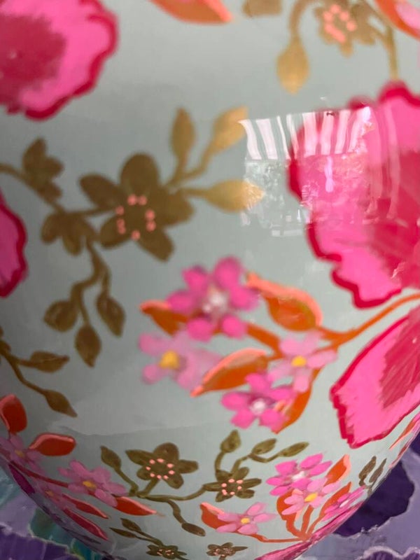 Deze prachtige kleur blauwe vaas, is rondom gedetailleerd beschilderd met vrolijke bloemen en takjes goud.