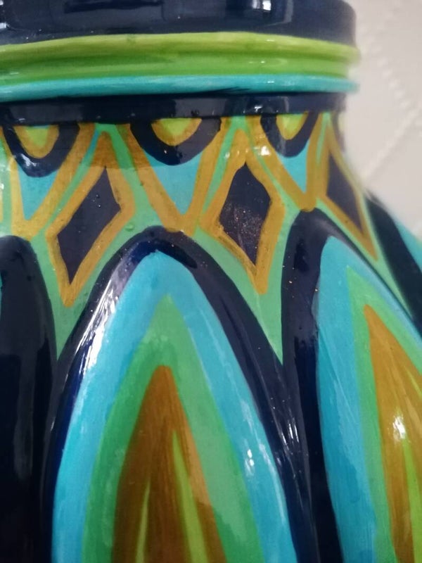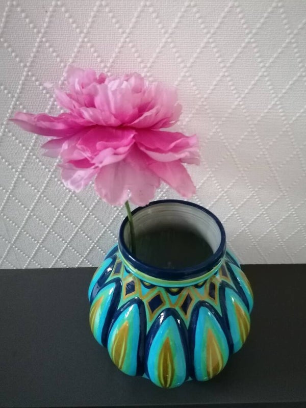 Mooie vaas in blauwtinten geaccentueerd met goudkleur.