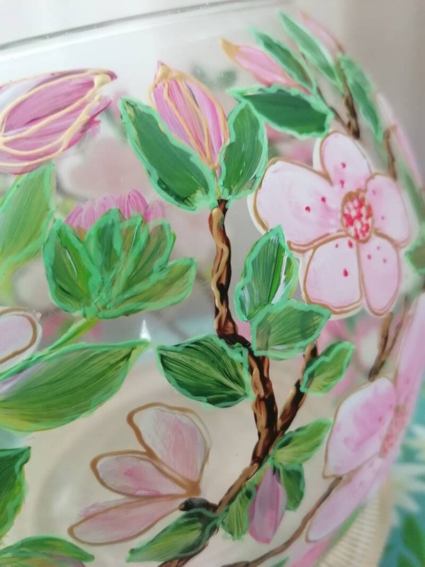 De bloemen en blaadjes zijn bewerkt met gouden reliëfverf, zo mooi!