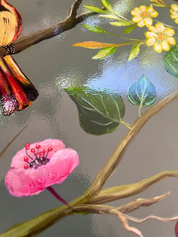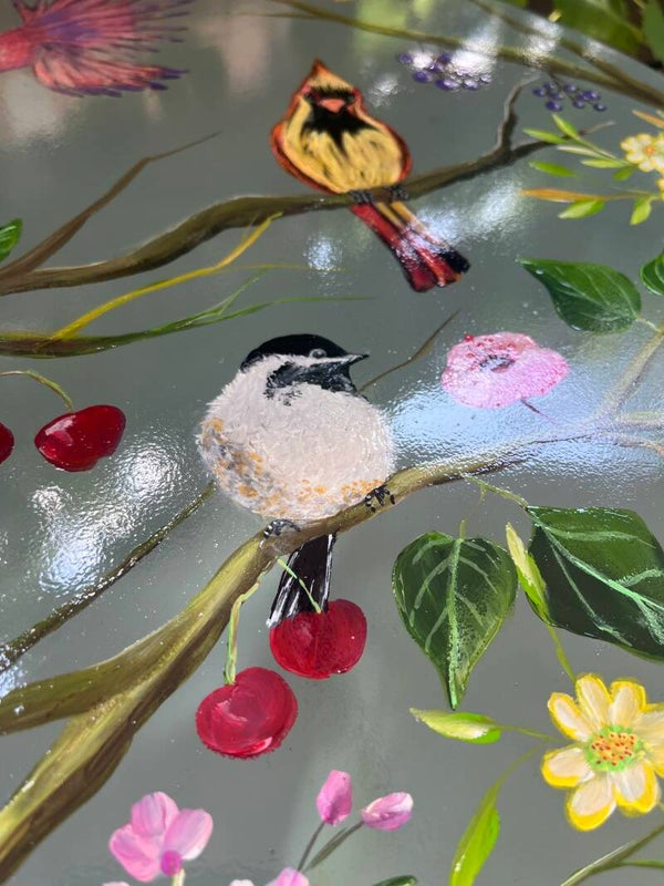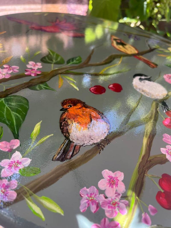 De tafel heb ik handbeschilderd met vogels, bessen & kersen, die omlijst zijn door mooie bloesem en andere kleurrijke bloemen!
