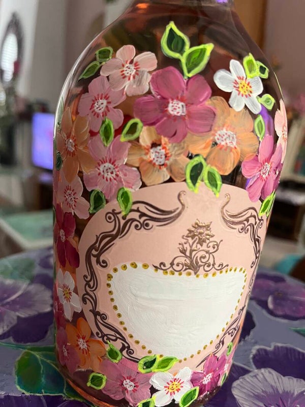 De heerlijke fles fruitige Rosé is handbeschilderd met vrolijke bloemen!