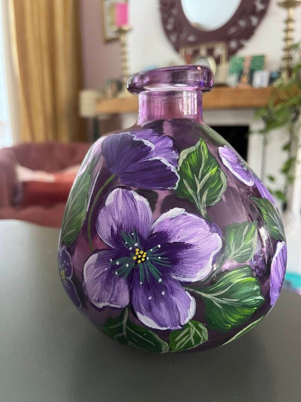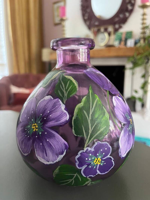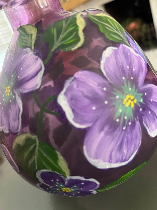 Op een ondergrond van een paars bolvaasje van glas, zijn rondom bloemen geschilderd met fris groene sierlijke bladeren, het vormt samen een prachtig geheel!