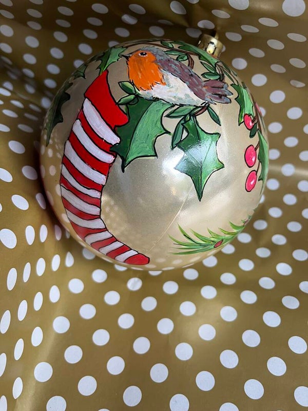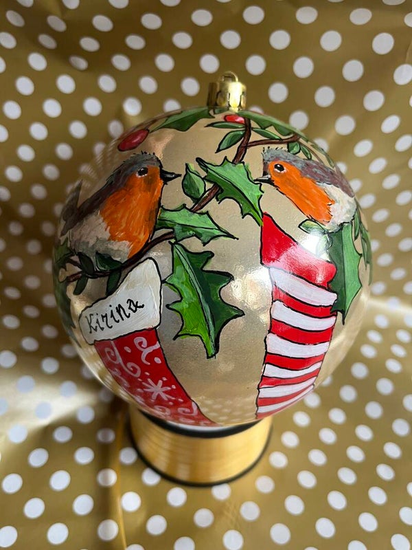 Handbeschilderde kerstbal 'Roodborstjes'.
