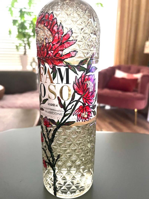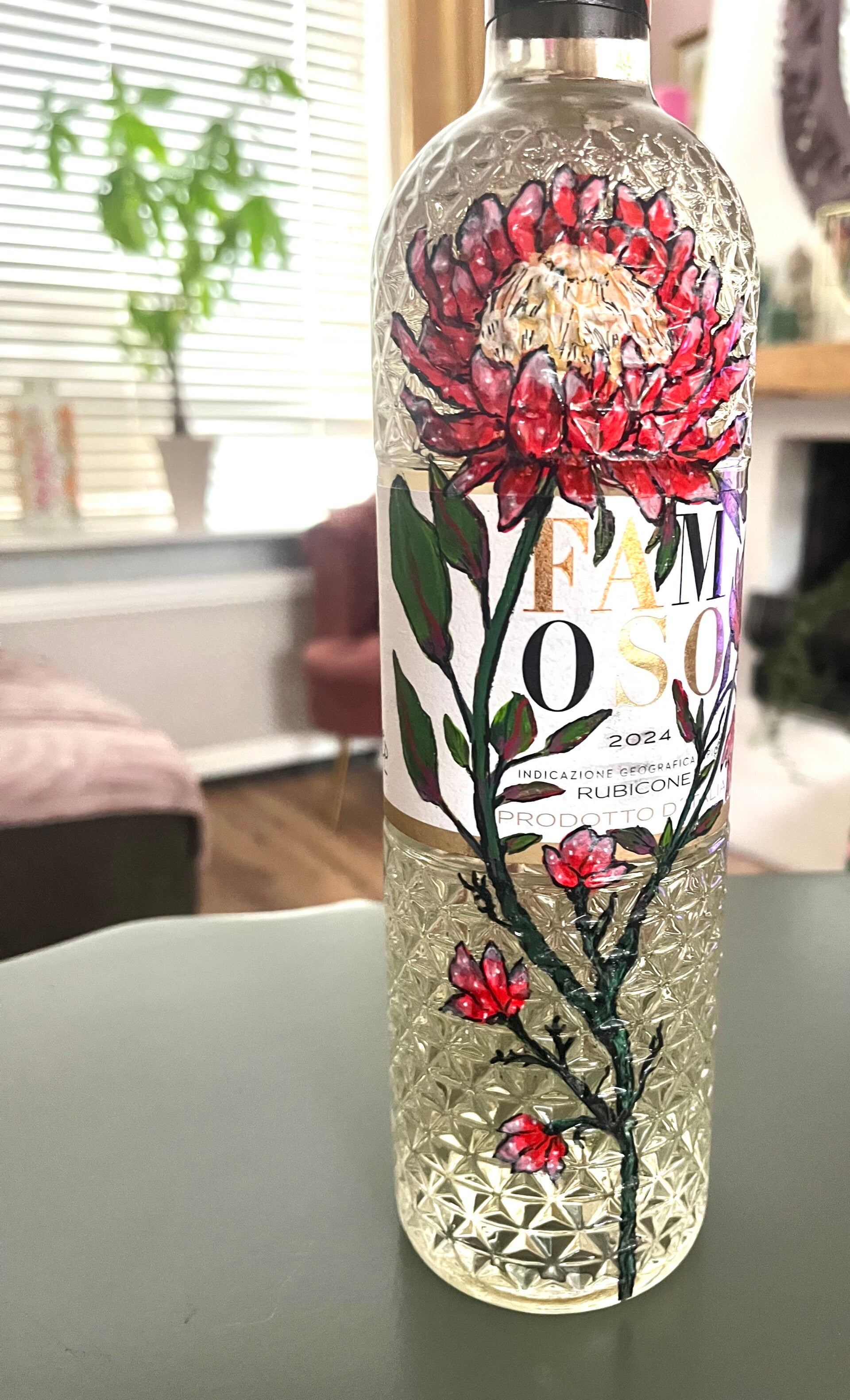 Een heerlijke fles witte wijn HANBESCHILDERD met mooie sierlijke rode bloem!