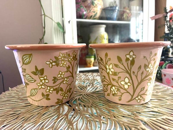 Op een zacht roze kleur ondergrond van de pot, zijn sierlijke bloemetjes in goud kleur getekend.